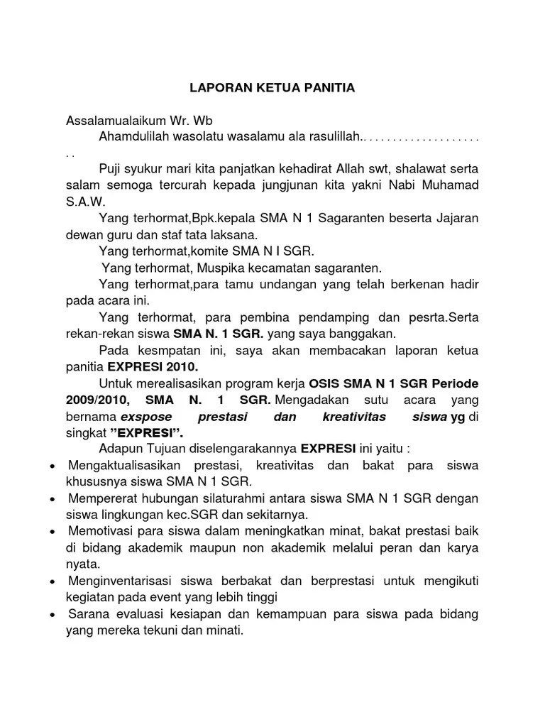 Teks ini adalah sebuah contoh laporan ketua panitia pada sebuah kegiatan. Silahkan sesuaikan dengan kegiatan lembaga andafull description . Kata pengantar sambutan ketua pelaksana sambutan rektor sambutan dekan. Laporan ketua panitia dalam pembukaan lokakarya. Yang kami hormati, deputi bidang pengembangan teknologi dan . Disampaikan dalam acara pembukaan kegiatan santiaji. Salam sejahtera untuk kita semua,. Panitia pelaksana kkn universitas kutai kartanegara angkatan xii tahun 2010. Khazanah arsip laporan ketua panitia pelaksana kegiatan sosialisasi pelayanan administrasi kependudukan tahun 2018. Doc contoh laporan kegiatan josan jefan academia edu laporan pelaksanaan kegiatan divisi ppid polri 9 contoh laporan kegiatan 9 contoh laporan . Laporan ketua panitia dalam penutupan lokakarya . Oleh bapak jon yosnedi, s.sos d. Yang sudah memberikan kepercayaan kepada fakultas ilmu pendidikan untuk menjadi pelaksana kegiatan dies uny tahun 2021 ini.